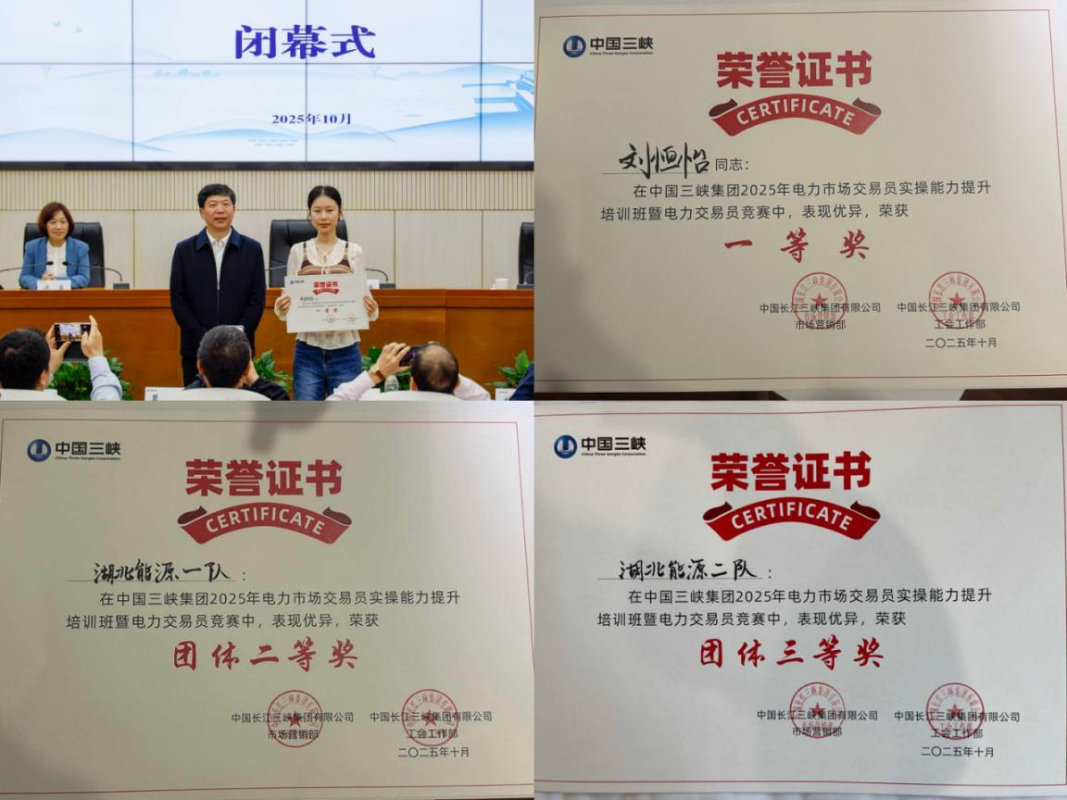 10月28日至31日,三峽集團在宜昌舉辦2025年電力市場交易員實操能力提升培訓(xùn)班暨電力交易員競賽。來自長江電力、三峽能源、湖北能源等多家單位共93名選手、31支隊伍同臺競技。經(jīng)過激烈角逐,新能源公司劉恒怡個人成績位列第一名,榮獲個人一等獎;湖北能源一隊(顧望、聶赟、劉恒怡)斬獲團隊二等獎,湖北能源二隊(周子天、李向龍、夏文馨)奪得團隊三等獎;售電公司夏文馨、湯光植、顧望,鄂州發(fā)電公司聶赟,襄陽宜城發(fā)電公司朱杰文,漢江能源公司周子天等6人榮獲個人優(yōu)秀獎。